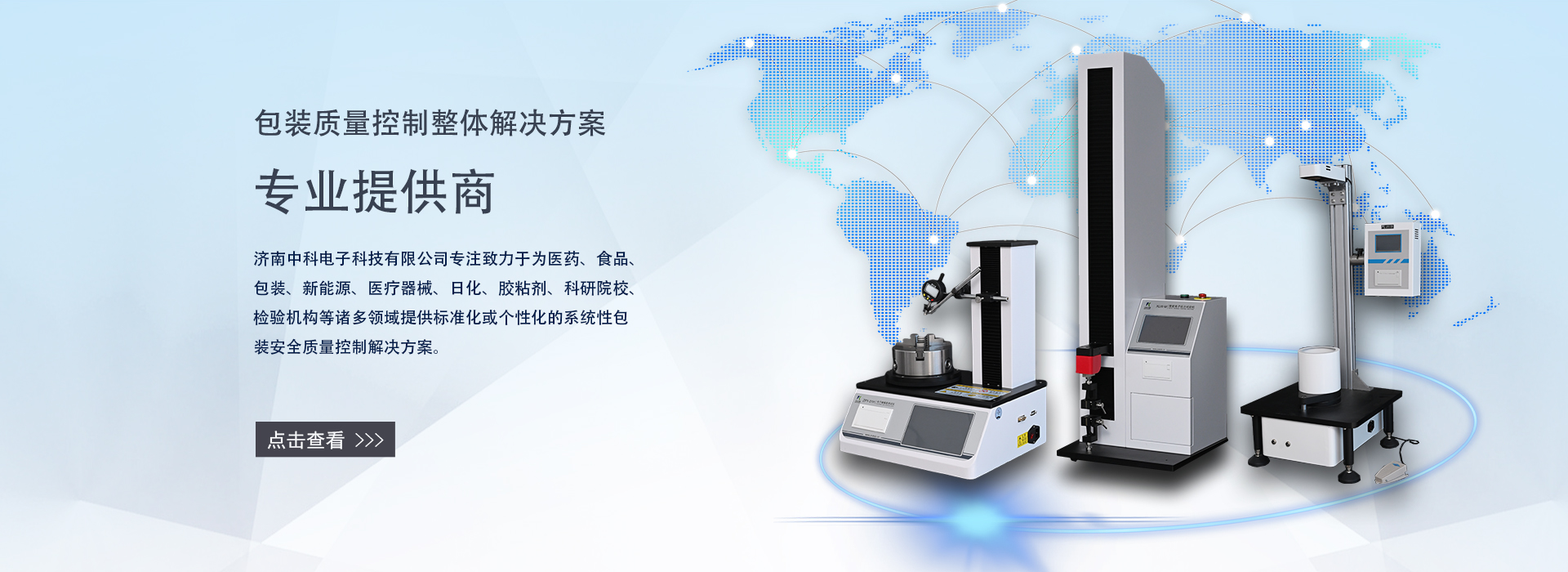 濟(jì)南中科電子科技有限公司是一家集包裝及膜材檢測(cè)儀器的研發(fā)、制造、銷售和服務(wù)為一體的專業(yè)科技公司。專注致力于為食品、醫(yī)藥、包裝、新能源、醫(yī)療器械、石化、日化、膠粘劑、科研院校、檢驗(yàn)機(jī)構(gòu)等諸多領(lǐng)域提供標(biāo)準(zhǔn)化或個(gè)性化的系統(tǒng)性包裝及膜材質(zhì)量控制解決方案。